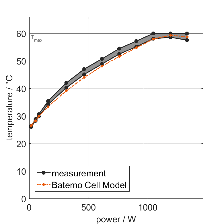 The cell is discharged from 100% SOC with different constant currents at 25°C. The thermal boundary condi­tion is free convec­tion. The measure­ment stops when reaching either the voltage of 2V or the surface temper­a­ture of 60°C. The graph shows the cell surface temper­a­ture at the end and the derived average power of the experiment.