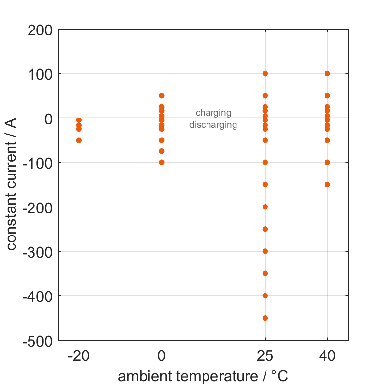 The cell is discharged from 100% SOC or charged from 0% SOC with current pulses followed by no-load phases at different ambient temper­a­tures. The thermal boundary condi­tion is free convec­tion. The measure­ment stops when reaching either the voltage of 2V or 3.65V or the surface temper­a­ture of 60°C. The graph shows for which ambient temper­a­tures and pulse currents measure­ments are available.