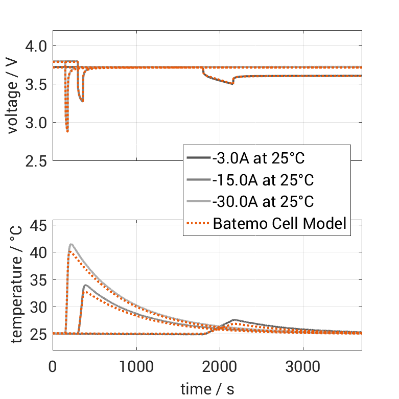 The Batemo Cell Model of the lithium-ion battery cell DMEGC INR18650-30P is a high-preci­sion, physical cell model with global validity. As a digital twin it seamlessly integrates into your research, development and battery analytics by basing your decisions on simula­tions. See the details to learn more about the features and capabil­i­ties of the Batemo Cell Model.