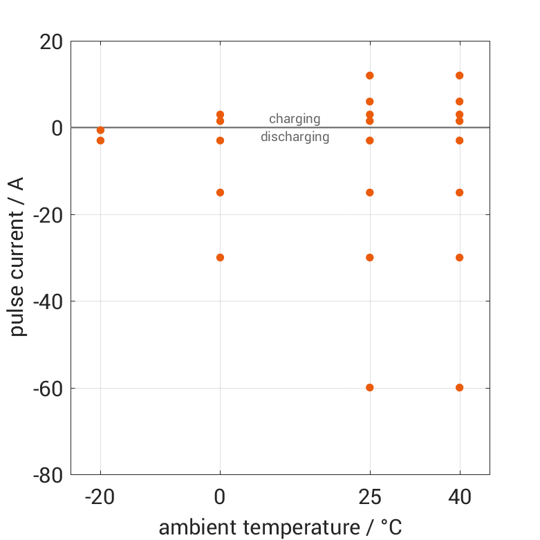 The cell is discharged from 100% SOC or charged from 0% SOC with current pulses followed by no-load phases at different ambient temper­a­tures. The thermal boundary condi­tion is free convec­tion. The measure­ment stops when reaching either the voltage of 2.5V or 4.2V or the surface temper­a­ture of 80°C. The graph shows for which ambient temper­a­tures and pulse currents measure­ments are available.
