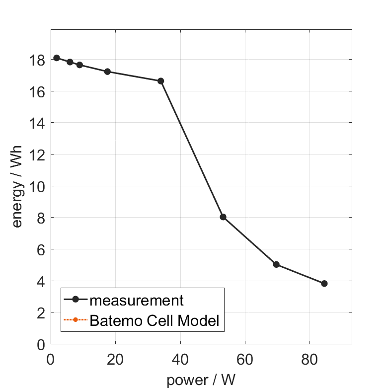 The cell is discharged from 100% SOC with different constant currents at 25°C. The thermal boundary condi­tion is free convec­tion. The measure­ment stops when reaching either the voltage of 2.5V or the surface temper­a­ture of 60°C. The graph shows the derived exchanged energy and average power of the experiment.