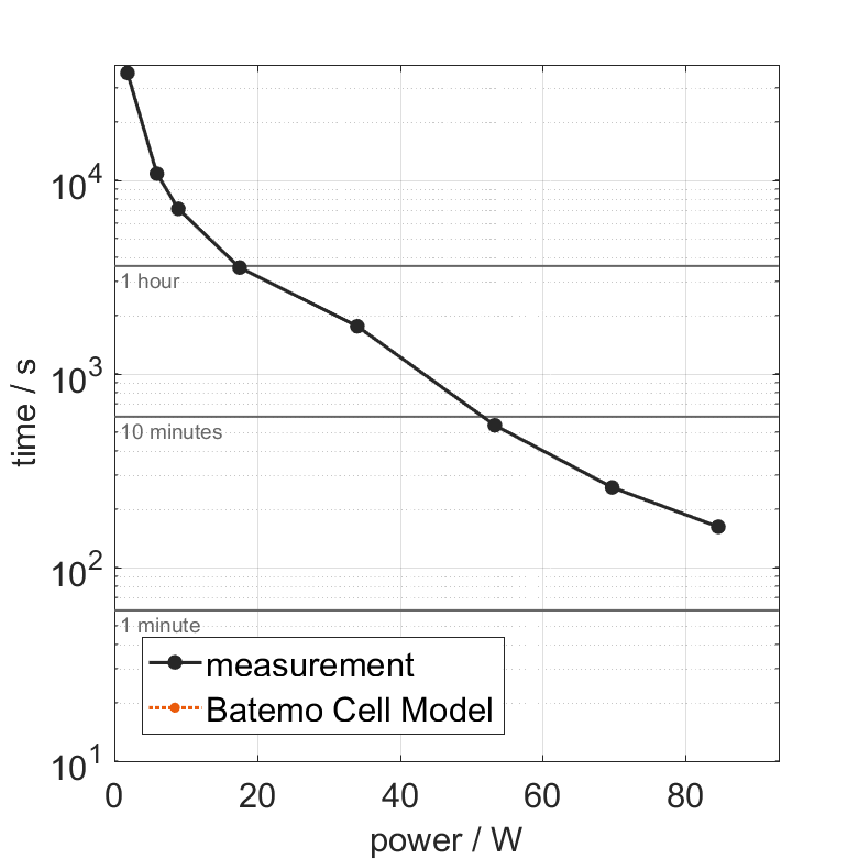 The cell is discharged from 100% SOC with different constant currents at 25°C. The thermal boundary condi­tion is free convec­tion. The measure­ment stops when reaching either the voltage of 2.5V or the surface temper­a­ture of 60°C. The graph shows the derived exper­i­ment duration and average power of the experiment.