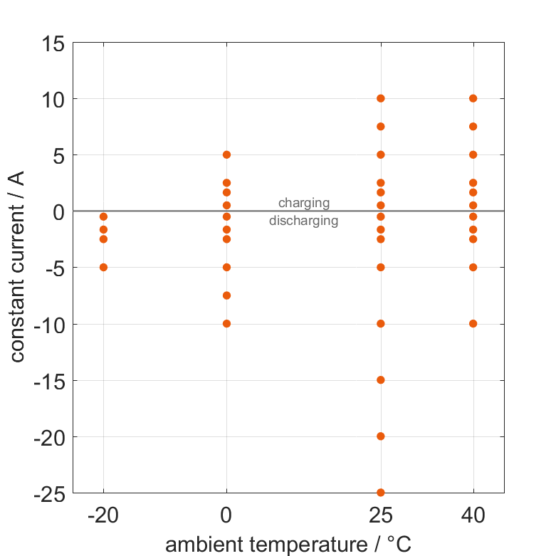 The cell is discharged from 100% SOC or charged from 0% SOC with different constant currents at different ambient temper­a­tures. The thermal boundary condi­tion is free convec­tion. The measure­ment stops when reaching either the voltage of 2.5V or 4.2V or the surface temper­a­ture of 60°C. The graph shows for which ambient temper­a­tures and charging and discharging constant currents measure­ments are available.