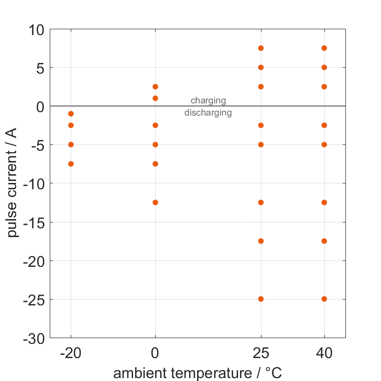 The cell is discharged from 100% SOC or charged from 0% SOC with current pulses followed by no-load phases at different ambient temper­a­tures. The thermal boundary condi­tion is free convec­tion. The measure­ment stops when reaching either the voltage of 2.5V or 4.2V or the surface temper­a­ture of 60°C. The graph shows for which ambient temper­a­tures and pulse currents measure­ments are available.