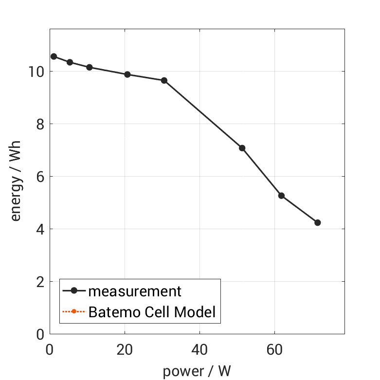 Moreover, the Batemo Cell Model validation will be fully transparent. The Batemo Cell Data contains the raw measurement and simulation data. For all experiments the voltage, temperature, power and energy accuracies are calculated. This allows straight-forward evaluation and analysis of the Batemo Cell Model validity. The graphs show a selection of characteristic data of the cell EFEST INR18650-30EF to evaluate the cell performance. The prediction of the Batemo Cell Model is included as soon as the Batemo Cell Model is finished.