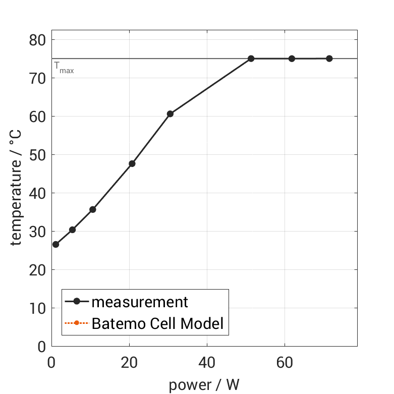 All quantities are measurement results from the Batemo battery laboratory. The continuous power is the highest power that completely discharges the cell without overheating it. Therefore, the cell is discharged from 100% state of charge (SOC) at an ambient temperature of 25°C with a constant current until a residual state of charge of 10% and either the lower voltage limit of 2.5V or 90% of the maximum surface temperature ( 68°C) is reached. The peak power is the power the cell can supply for 5 minutes. The cell is therefore discharged from 100% SOC at an ambient temperature of 25°C with a constant current until it reaches either the lower voltage limit of 2.5V or the maximum surface temperature of 75°C after 5 minutes. For cells that reach the maximum temperature limit, the measured power is directly taken as peak power. For cells that do not reach the maximum surface temperature after 5 minutes because they reach the lower voltage limit first, the measured power is multiplied by a correction factor that estimates the power that would have heated the cell to the maximum surface temperature within 5 minutes. The thermal boundary condition is free convection. These operating conditions may be outside the cell manufacturer’s specification. |