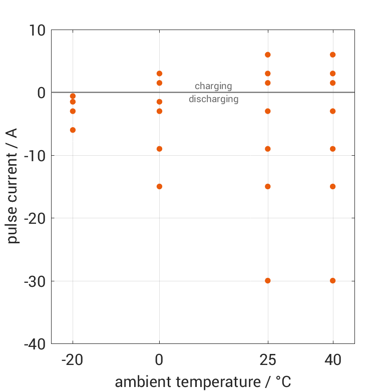 The cell is discharged from 100% SOC or charged from 0% SOC with current pulses followed by no-load phases at different ambient temperatures. The thermal boundary condition is free convection. The measurement stops when reaching either the voltage of 2.5V or 4.2V or the surface temperature of 75°C. The graph shows for which ambient temperatures and pulse currents measurements are available.