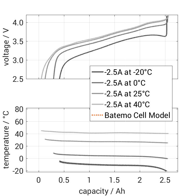 The cell is discharged from 100% SOC with different constant currents at different ambient temper­a­tures. The thermal boundary condi­tion is free convec­tion. The measure­ment stops when reaching either the voltage of 2.5V or the surface temper­a­ture of 80°C.
