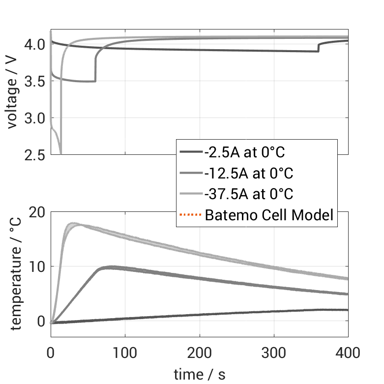 The cell is discharged from 100% SOC with current pulses followed by no-load phases at different ambient temper­a­tures. The thermal boundary condi­tion is free convec­tion. The measure­ment stops when reaching either the voltage of 2.5V or the surface temper­a­ture of 80°C. The graph shows a zoomed view of the measure­ment to visualize one of the pulses.