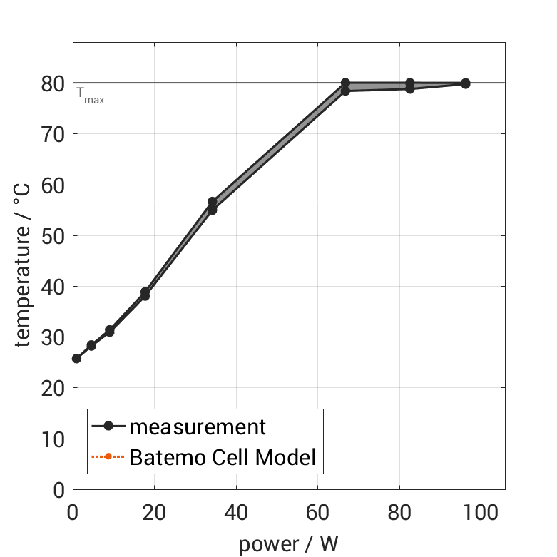 The cell is discharged from 100% SOC with different constant currents at 25°C. The thermal boundary condi­tion is free convec­tion. The measure­ment stops when reaching either the voltage of 2.5V or the surface temper­a­ture of 80°C. The graph shows the cell surface temper­a­ture at the end and the derived average power of the experiment.