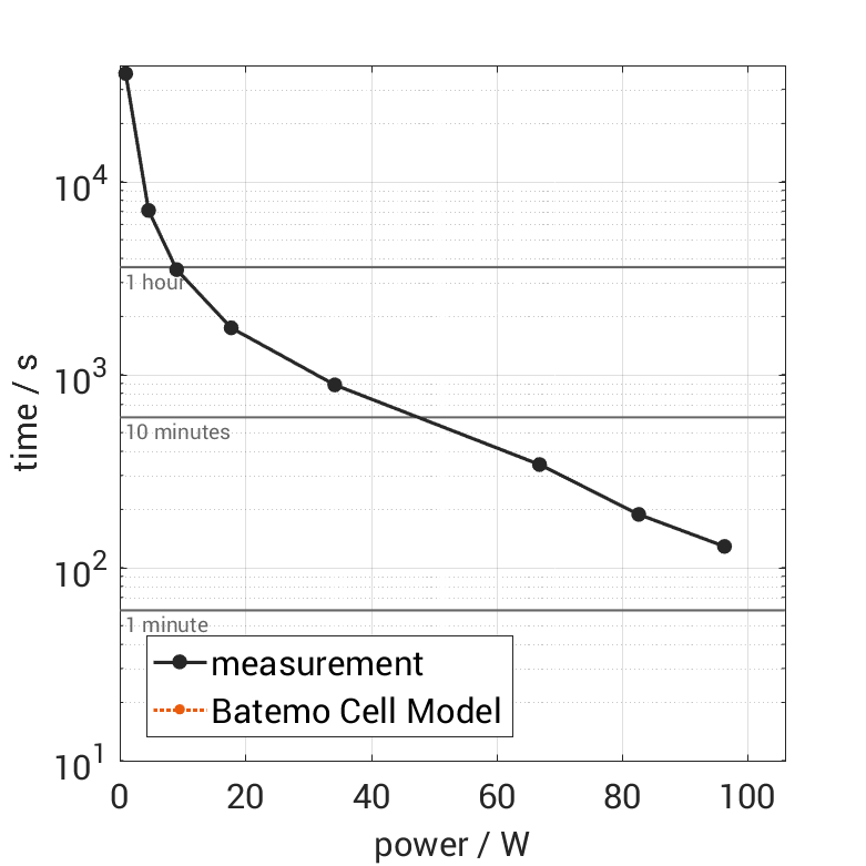 The cell is discharged from 100% SOC with different constant currents at 25°C. The thermal boundary condi­tion is free convec­tion. The measure­ment stops when reaching either the voltage of 2.5V or the surface temper­a­ture of 80°C. The graph shows the derived exper­i­ment duration and average power of the experiment.