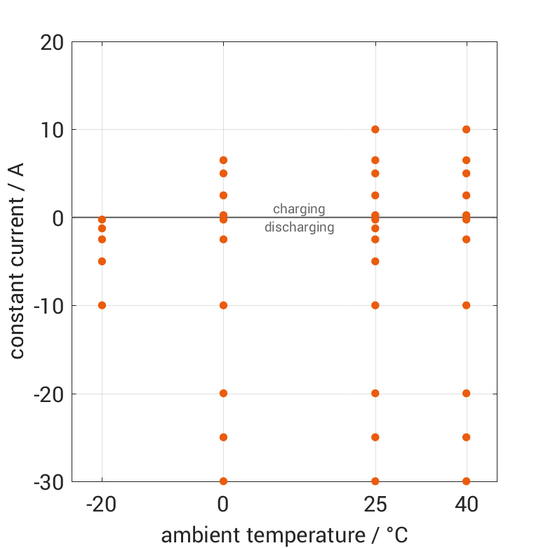 The cell is discharged from 100% SOC or charged from 0% SOC with different constant currents at different ambient temper­a­tures. The thermal boundary condi­tion is free convec­tion. The measure­ment stops when reaching either the voltage of 2.5V or 4.2V or the surface temper­a­ture of 80°C. The graph shows for which ambient temper­a­tures and charging and discharging constant currents measure­ments are available.