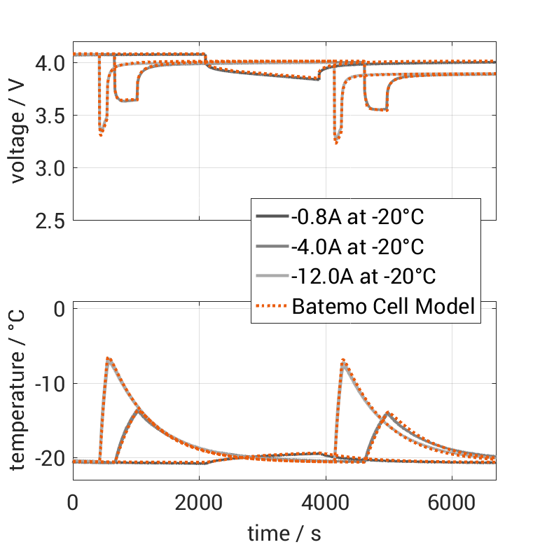 Batemo demonstrates the accuracy and validity of the Batemo Cell Model by comparing battery simulation and measurement data in the range given below. Validation is extensive, experimental characterization covers the total operational area of the cell: At low and high temperatures, up to the maximal current and in the whole state of charge range.