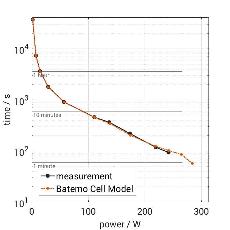 All quantities are measurement results from the Batemo battery laboratory. The continuous power is the highest power that completely discharges the cell without overheating it. Therefore, the cell is discharged from 100% state of charge (SOC) at an ambient temperature of 25°C with a constant current until a residual state of charge of 10% and either the lower voltage limit of 2.5V or 90% of the maximum surface temperature ( 72°C) is reached. The peak power is the power the cell can supply for 5 minutes. The cell is therefore discharged from 100% SOC at an ambient temperature of 25°C with a constant current until it reaches either the lower voltage limit of 2.5V or the maximum surface temperature of 80°C after 5 minutes. For cells that reach the maximum temperature limit, the measured power is directly taken as peak power. For cells that do not reach the maximum surface temperature after 5 minutes because they reach the lower voltage limit first, the measured power is multiplied by a correction factor that estimates the power that would have heated the cell to the maximum surface temperature within 5 minutes. The thermal boundary condition is free convection. These operating conditions may be outside the cell manufacturer’s specification. |