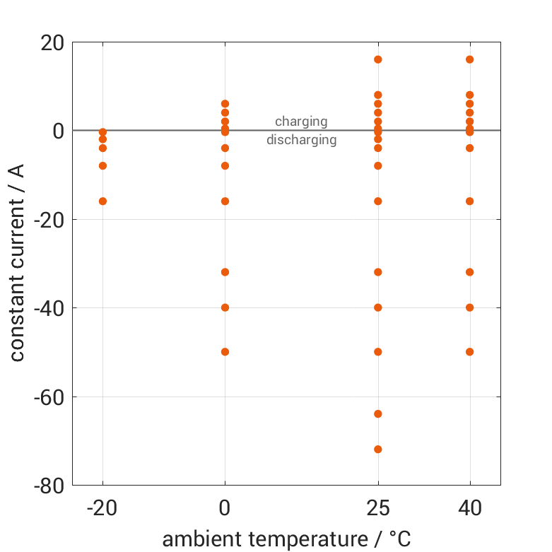 The cell is discharged from 100% SOC or charged from 0% SOC with different constant currents at different ambient temperatures. The thermal boundary condition is free convection. The measurement stops when reaching either the voltage of 2.5V or 4.2V or the surface temperature of 80°C. The graph shows for which ambient temperatures and charging and discharging constant currents measurements are available.