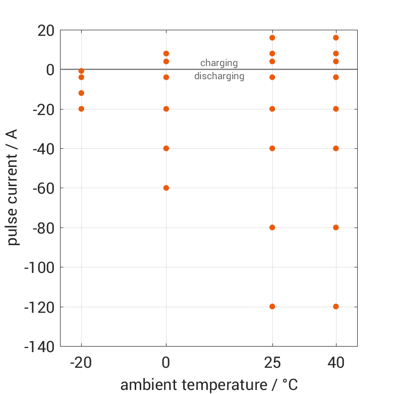 The cell is discharged from 100% SOC or charged from 0% SOC with current pulses followed by no-load phases at different ambient temperatures. The thermal boundary condition is free convection. The measurement stops when reaching either the voltage of 2.5V or 4.2V or the surface temperature of 80°C. The graph shows for which ambient temperatures and pulse currents measurements are available.