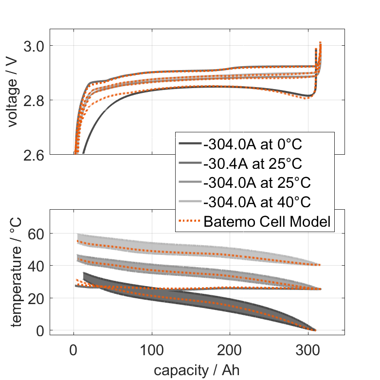 The Batemo Cell Model of the lithium-ion battery cell EVE Energy LF304 is a high-precision, physical cell model with global validity. As a digital twin it seamlessly integrates into your research, development and battery analytics by basing your decisions on simulations. See the details to learn more about the features and capabilities of the Batemo Cell Model.