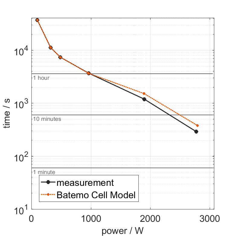 All quantities are measurement results from the Batemo battery laboratory. The continuous power is the highest power that completely discharges the cell without overheating it. Therefore, the cell is discharged from 100% state of charge (SOC) at an ambient temperature of 25°C with a constant current until a residual state of charge of 10% and either the lower voltage limit of 2.5V or 90% of the maximum surface temperature ( 59°C) is reached. The peak power is the power the cell can supply for 5 minutes. The cell is therefore discharged from 100% SOC at an ambient temperature of 25°C with a constant current until it reaches either the lower voltage limit of 2.5V or the maximum surface temperature of 65°C after 5 minutes. For cells that reach the maximum temperature limit, the measured power is directly taken as peak power. For cells that do not reach the maximum surface temperature after 5 minutes because they reach the lower voltage limit first, the measured power is multiplied by a correction factor that estimates the power that would have heated the cell to the maximum surface temperature within 5 minutes. The thermal boundary condition is free convection. These operating conditions may be outside the cell manufacturer’s specification. |