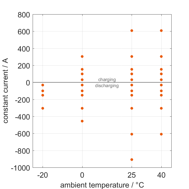 The cell is discharged from 100% SOC or charged from 0% SOC with different constant currents at different ambient temperatures. The thermal boundary condition is free convection. The measurement stops when reaching either the voltage of 2.5V or 3.65V or the surface temperature of 65°C. The graph shows for which ambient temperatures and charging and discharging constant currents measurements are available.