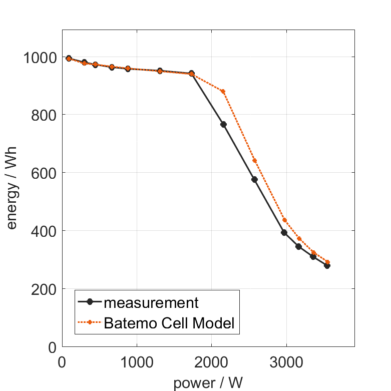 All quantities are measurement results from the Batemo battery laboratory. The continuous power is the highest power that completely discharges the cell without overheating it. Therefore, the cell is discharged from 100% state of charge (SOC) at an ambient temperature of 25°C with a constant current until a residual state of charge of 10% and either the lower voltage limit of 2.5V or 90% of the maximum surface temperature ( 50°C) is reached. The peak power is the power the cell can supply for 5 minutes. The cell is therefore discharged from 100% SOC at an ambient temperature of 25°C with a constant current until it reaches either the lower voltage limit of 2.5V or the maximum surface temperature of 55°C after 5 minutes. For cells that reach the maximum temperature limit, the measured power is directly taken as peak power. For cells that do not reach the maximum surface temperature after 5 minutes because they reach the lower voltage limit first, the measured power is multiplied by a correction factor that estimates the power that would have heated the cell to the maximum surface temperature within 5 minutes. The thermal boundary condition is free convection. These operating conditions may be outside the cell manufacturer’s specification. |