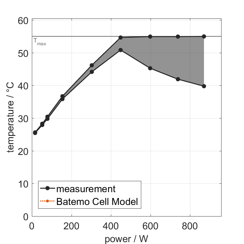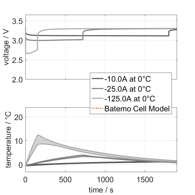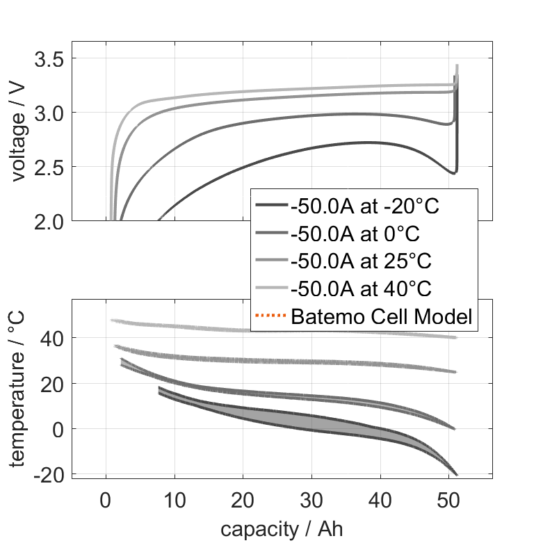 The Batemo Cell Model of the lithium-ion battery cell Far East Battery (FEB) 125163233-50Ah is a high-precision, physical cell model with global validity. As a digital twin it seamlessly integrates into your research, development and battery analytics by basing your decisions on simulations. See the details to learn more about the features and capabilities of the Batemo Cell Model. Batemo demonstrates the accuracy and validity of the Batemo Cell Model by comparing battery simulation and measurement data in the range given below. Validation is extensive, experimental characterization covers the total operational area of the cell: At low and high temperatures, up to the maximal current and in the whole state of charge range.