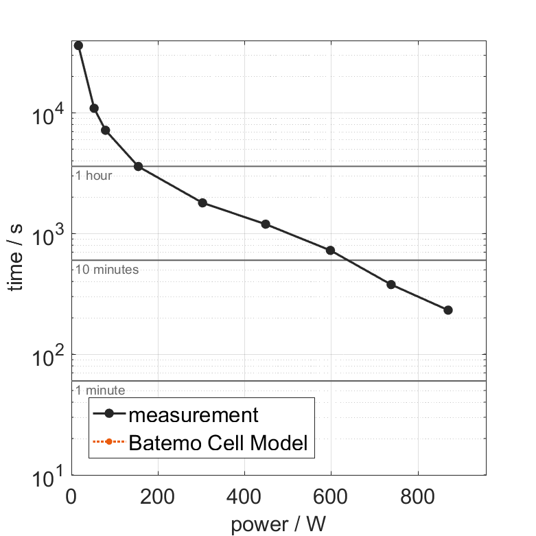 All quantities are measurement results from the Batemo battery laboratory. The continuous power is the highest power that completely discharges the cell without overheating it. Therefore, the cell is discharged from 100% state of charge (SOC) at an ambient temperature of 25°C with a constant current until a residual state of charge of 10% and either the lower voltage limit of 2V or 90% of the maximum surface temperature ( 50°C) is reached. The peak power is the power the cell can supply for 5 minutes. The cell is therefore discharged from 100% SOC at an ambient temperature of 25°C with a constant current until it reaches either the lower voltage limit of 2V or the maximum surface temperature of 55°C after 5 minutes. For cells that reach the maximum temperature limit, the measured power is directly taken as peak power. For cells that do not reach the maximum surface temperature after 5 minutes because they reach the lower voltage limit first, the measured power is multiplied by a correction factor that estimates the power that would have heated the cell to the maximum surface temperature within 5 minutes. The thermal boundary condition is free convection. These operating conditions may be outside the cell manufacturer’s specification. |