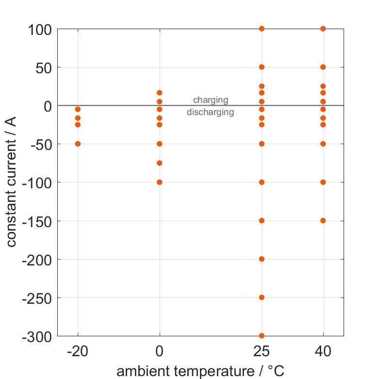 The cell is discharged from 100% SOC or charged from 0% SOC with different constant currents at different ambient temperatures. The thermal boundary condition is free convection. The measurement stops when reaching either the voltage of 2V or 3.65V or the surface temperature of 55°C. The graph shows for which ambient temperatures and charging and discharging constant currents measurements are available.