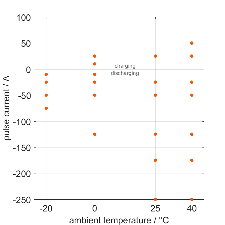 The cell is discharged from 100% SOC or charged from 0% SOC with current pulses followed by no-load phases at different ambient temperatures. The thermal boundary condition is free convection. The measurement stops when reaching either the voltage of 2V or 3.65V or the surface temperature of 55°C. The graph shows for which ambient temperatures and pulse currents measurements are available.