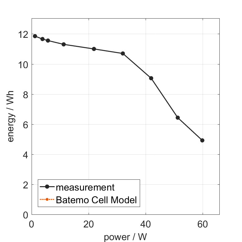 The cell is discharged from 100% SOC with different constant currents at 25°C. The thermal boundary condi­tion is free convec­tion. The measure­ment stops when reaching either the voltage of 2.5V or the surface temper­a­ture of 60°C. The graph shows the derived exchanged energy and average power of the experiment.