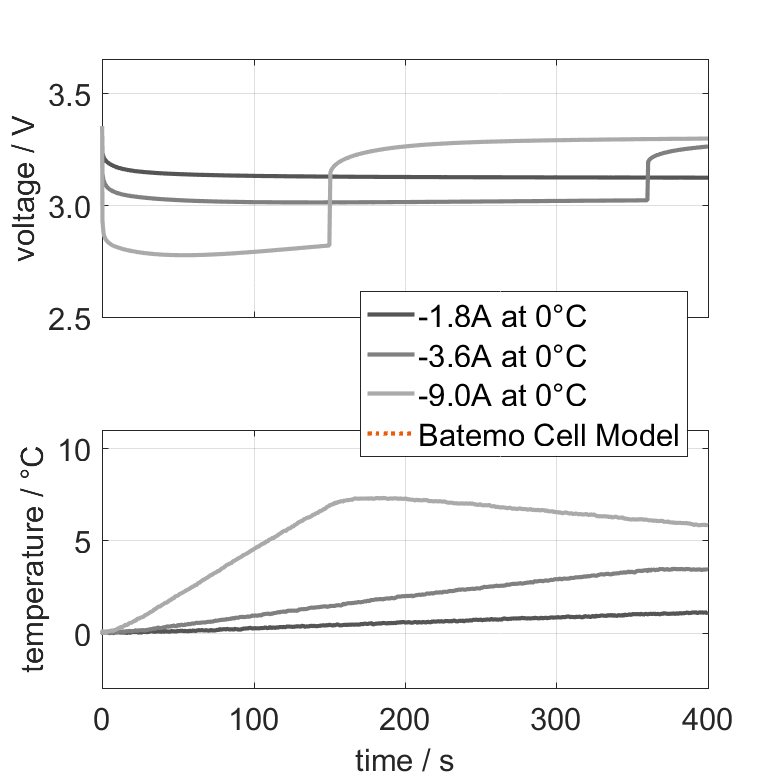 The Batemo Cell Model of the lithium-ion battery cell Golden­cell HTCFR26650-3600 is a high-preci­sion, physical cell model with global validity. As a digital twin it seamlessly integrates into your research, development and battery analytics by basing your decisions on simula­tions. See the details to learn more about the features and capabil­i­ties of the Batemo Cell Model. Batemo demon­strates the accuracy and validity of the Batemo Cell Model by comparing battery simula­tion and measure­ment data in the range given below. Valida­tion is exten­sive, exper­i­mental charac­ter­i­za­tion covers the total opera­tional area of the cell: At low and high temper­a­tures, up to the maximal current and in the whole state of charge range.