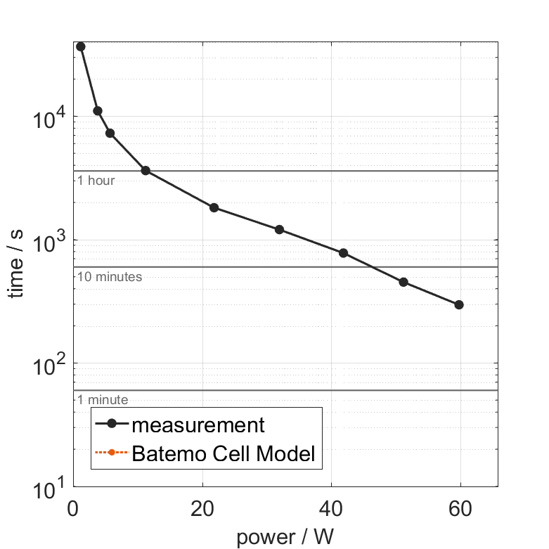 The cell is discharged from 100% SOC with different constant currents at 25°C. The thermal boundary condi­tion is free convec­tion. The measure­ment stops when reaching either the voltage of 2.5V or the surface temper­a­ture of 60°C. The graph shows the derived exper­i­ment duration and average power of the experiment.