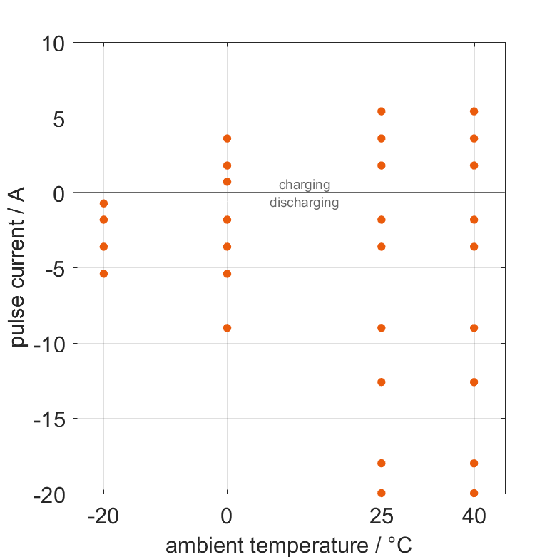 The cell is discharged from 100% SOC or charged from 0% SOC with current pulses followed by no-load phases at different ambient temper­a­tures. The thermal boundary condi­tion is free convec­tion. The measure­ment stops when reaching either the voltage of 2.5V or 3.6V or the surface temper­a­ture of 60°C. The graph shows for which ambient temper­a­tures and pulse currents measure­ments are available.