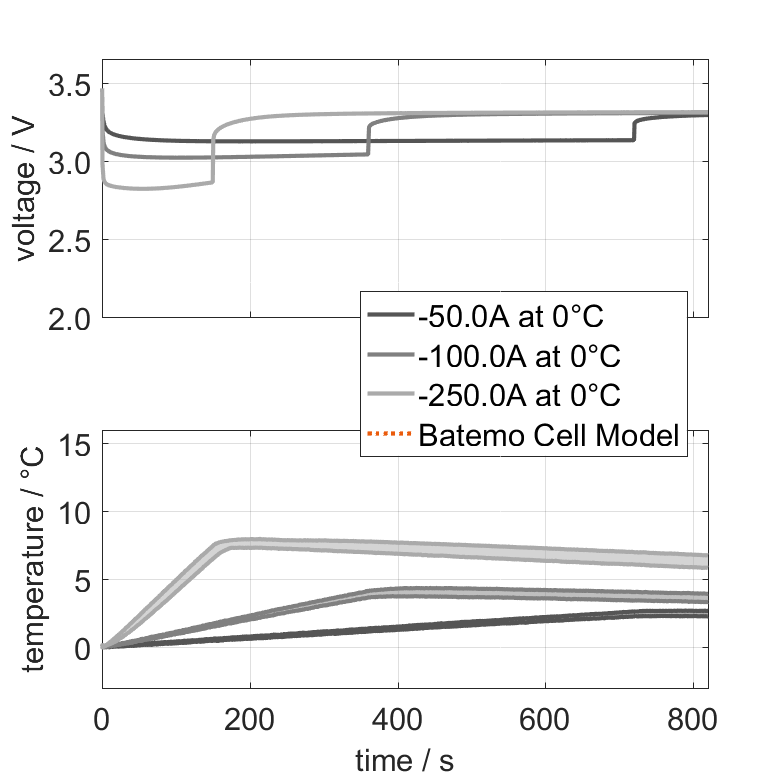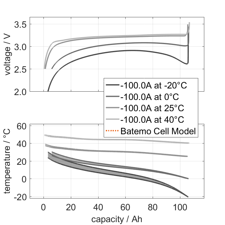 The Batemo Cell Model of the lithium-ion battery cell Highstar IFpP50160118-100P3 is a high-preci­sion, physical cell model with global validity. As a digital twin it seamlessly integrates into your research, development and battery analytics by basing your decisions on simula­tions. See the details to learn more about the features and capabil­i­ties of the Batemo Cell Model. Batemo demon­strates the accuracy and validity of the Batemo Cell Model by comparing battery simula­tion and measure­ment data in the range given below. Valida­tion is exten­sive, exper­i­mental charac­ter­i­za­tion covers the total opera­tional area of the cell: At low and high temper­a­tures, up to the maximal current and in the whole state of charge range.
