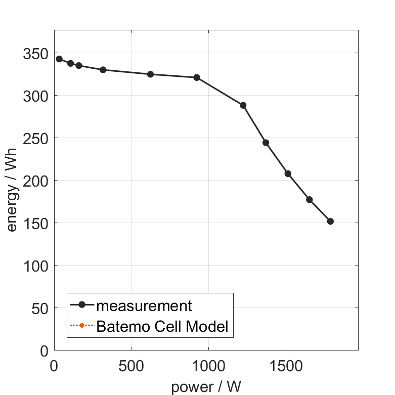 The cell is discharged from 100% SOC with different constant currents at 25°C. The thermal boundary condi­tion is free convec­tion. The measure­ment stops when reaching either the voltage of 2V or the surface temper­a­ture of 60°C. The graph shows the derived exchanged energy and average power of the experiment.