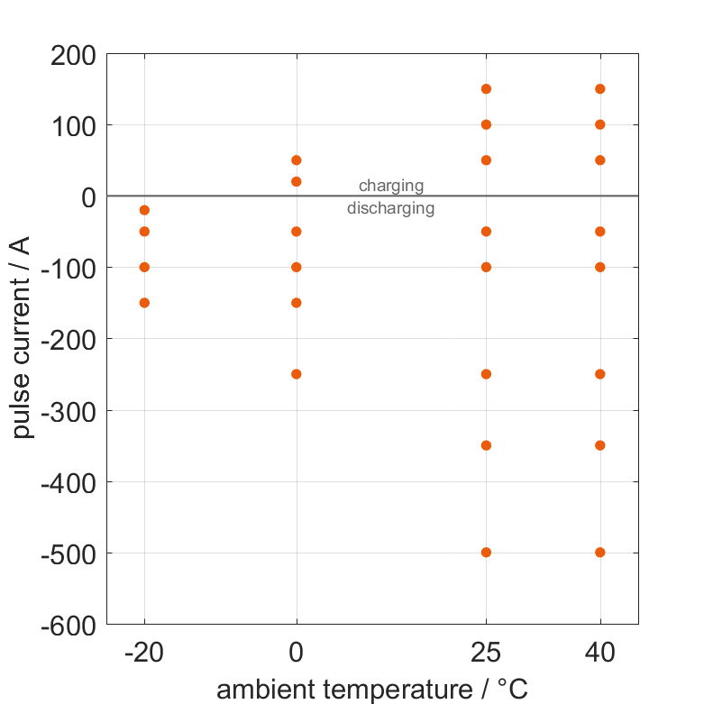 The cell is discharged from 100% SOC or charged from 0% SOC with current pulses followed by no-load phases at different ambient temper­a­tures. The thermal boundary condi­tion is free convec­tion. The measure­ment stops when reaching either the voltage of 2V or 3.65V or the surface temper­a­ture of 60°C. The graph shows for which ambient temper­a­tures and pulse currents measure­ments are available.