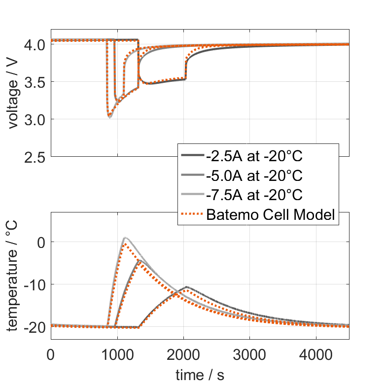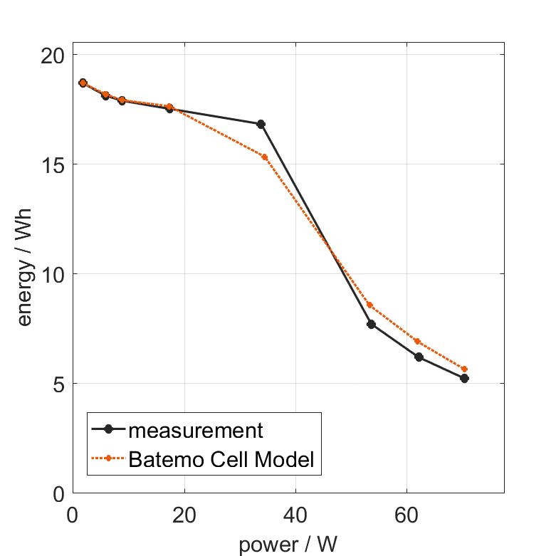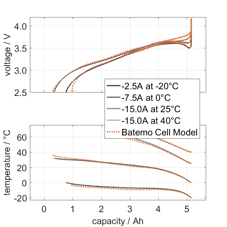 Batemo demonstrates the accuracy and validity of the Batemo Cell Model by comparing battery simulation and measurement data in the range given below. Validation is extensive, experimental characterization covers the total operational area of the cell: At low and high temperatures, up to the maximal current and in the whole state of charge range.