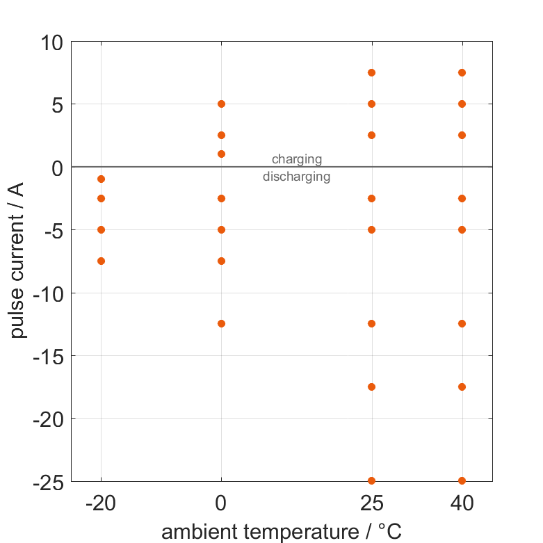 The cell is discharged from 100% SOC or charged from 0% SOC with current pulses followed by no-load phases at different ambient temperatures. The thermal boundary condition is free convection. The measurement stops when reaching either the voltage of 2.5V or 4.2V or the surface temperature of 60°C. The graph shows for which ambient temperatures and pulse currents measurements are available.