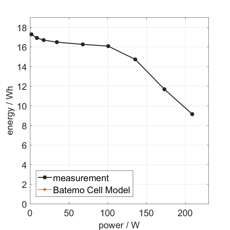 The cell is discharged from 100% SOC with different constant currents at 25°C. The thermal boundary condi­tion is free convec­tion. The measure­ment stops when reaching either the voltage of 2.5V or the surface temper­a­ture of 80°C. The graph shows the derived exchanged energy and average power of the experiment.