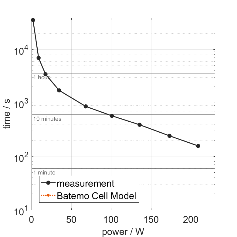 The cell is discharged from 100% SOC with different constant currents at 25°C. The thermal boundary condi­tion is free convec­tion. The measure­ment stops when reaching either the voltage of 2.5V or the surface temper­a­ture of 80°C. The graph shows the derived exper­i­ment duration and average power of the experiment.