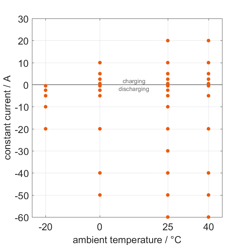 The cell is discharged from 100% SOC or charged from 0% SOC with different constant currents at different ambient temper­a­tures. The thermal boundary condi­tion is free convec­tion. The measure­ment stops when reaching either the voltage of 2.5V or 4.2V or the surface temper­a­ture of 80°C. The graph shows for which ambient temper­a­tures and charging and discharging constant currents measure­ments are available.
