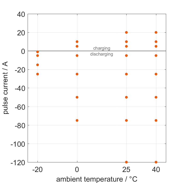 The cell is discharged from 100% SOC or charged from 0% SOC with current pulses followed by no-load phases at different ambient temper­a­tures. The thermal boundary condi­tion is free convec­tion. The measure­ment stops when reaching either the voltage of 2.5V or 4.2V or the surface temper­a­ture of 80°C. The graph shows for which ambient temper­a­tures and pulse currents measure­ments are available.