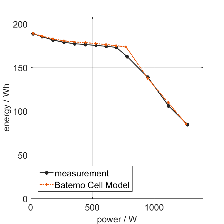 The cell is discharged from 100% SOC with different constant currents at 25°C. The thermal boundary condi­tion is free convec­tion. The measure­ment stops when reaching either the voltage of 2.5V or the surface temper­a­ture of 60°C. The graph shows the derived exchanged energy and average power of the experiment.