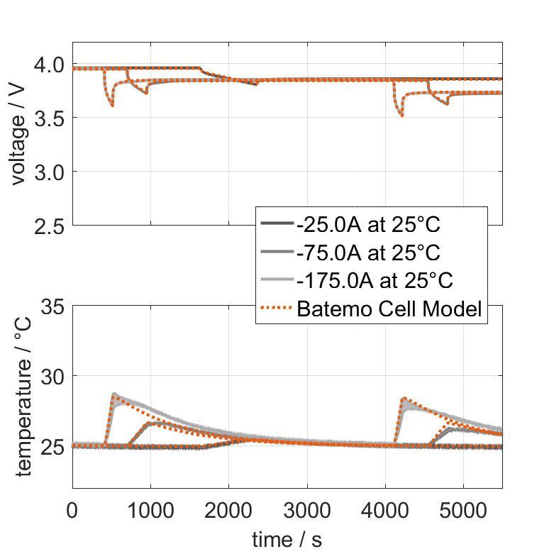 The Batemo Cell Model of the lithium-ion battery cell LG Chem A7 is a high-preci­sion, physical cell model with global validity. As a digital twin it seamlessly integrates into your research, development and battery analytics by basing your decisions on simula­tions. See the details to learn more about the features and capabil­i­ties of the Batemo Cell Model.