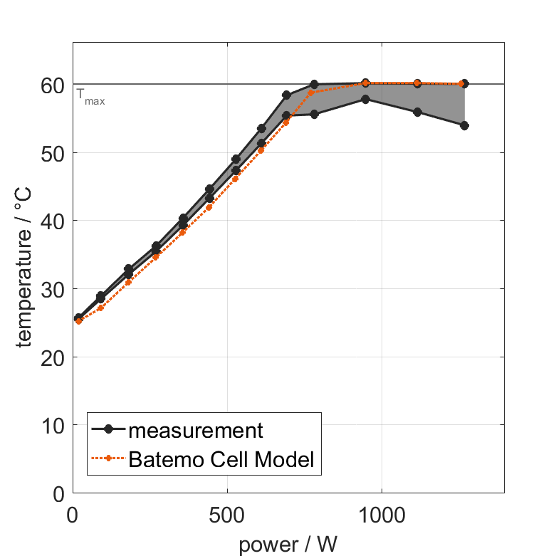 The cell is discharged from 100% SOC with different constant currents at 25°C. The thermal boundary condi­tion is free convec­tion. The measure­ment stops when reaching either the voltage of 2.5V or the surface temper­a­ture of 60°C. The graph shows the cell surface temper­a­ture at the end and the derived average power of the experiment.