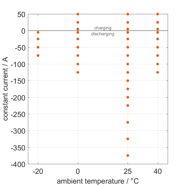 The cell is discharged from 100% SOC or charged from 0% SOC with current pulses followed by no-load phases at different ambient temper­a­tures. The thermal boundary condi­tion is free convec­tion. The measure­ment stops when reaching either the voltage of 2.5V or 4.2V or the surface temper­a­ture of 60°C. The graph shows for which ambient temper­a­tures and pulse currents measure­ments are available.