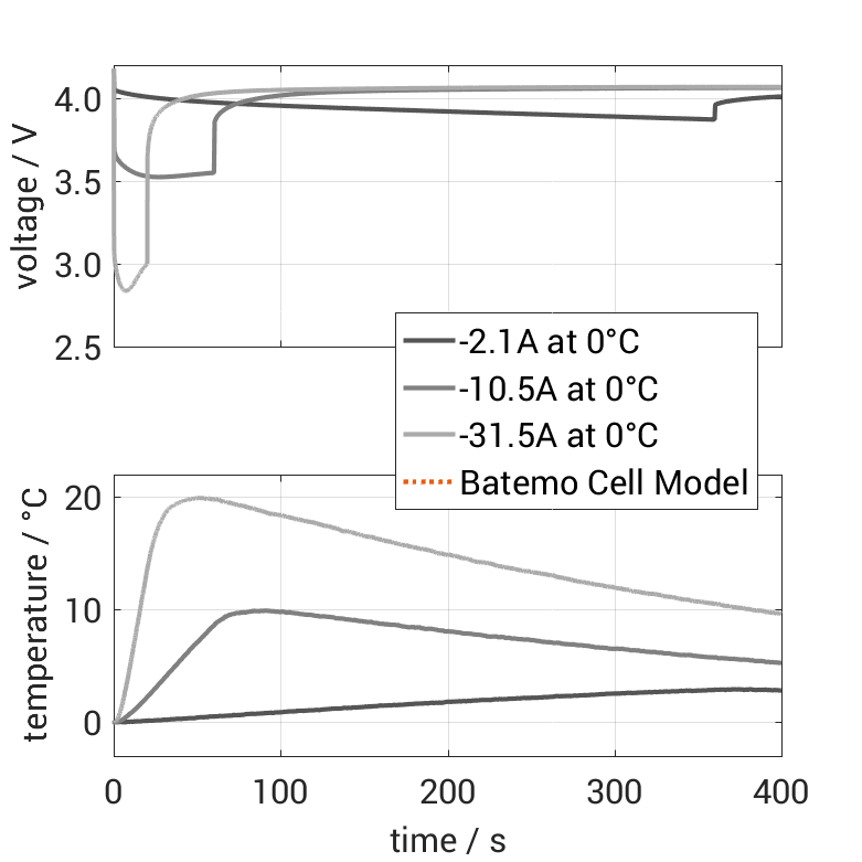 Moreover, the Batemo Cell Model validation will be fully transparent. The Batemo Cell Data contains the raw measurement and simulation data. For all experiments the voltage, temperature, power and energy accuracies are calculated. This allows straight-forward evaluation and analysis of the Batemo Cell Model validity. The graphs show a selection of characteristic data of the cell LG Chem ICR18650-HD2C to evaluate the cell performance. The prediction of the Batemo Cell Model is included as soon as the Batemo Cell Model is finished.
