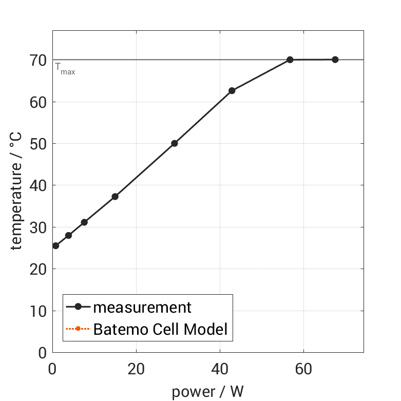 All quantities are measurement results from the Batemo battery laboratory. The continuous power is the highest power that completely discharges the cell without overheating it. Therefore, the cell is discharged from 100% state of charge (SOC) at an ambient temperature of 25°C with a constant current until a residual state of charge of 10% and either the lower voltage limit of 2.5V or 90% of the maximum surface temperature ( 63°C) is reached. The peak power is the power the cell can supply for 5 minutes. The cell is therefore discharged from 100% SOC at an ambient temperature of 25°C with a constant current until it reaches either the lower voltage limit of 2.5V or the maximum surface temperature of 70°C after 5 minutes. For cells that reach the maximum temperature limit, the measured power is directly taken as peak power. For cells that do not reach the maximum surface temperature after 5 minutes because they reach the lower voltage limit first, the measured power is multiplied by a correction factor that estimates the power that would have heated the cell to the maximum surface temperature within 5 minutes. The thermal boundary condition is free convection. These operating conditions may be outside the cell manufacturer’s specification. |