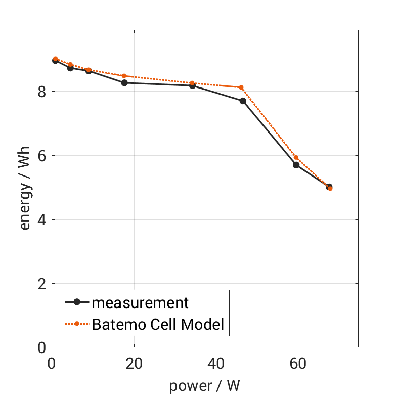 Moreover, the validation of the Batemo Cell Model is fully transparent. The Batemo Cell Data contains the raw measurement and simulation data. For all experiments the voltage, temperature, power and energy accuracies are calculated. This allows straight-forward evaluation and analysis of the Batemo Cell Model validity. The graphs show a selection of characteristic data of the cell LG Chem ICR18650-HE4 to evaluate the cell performance.