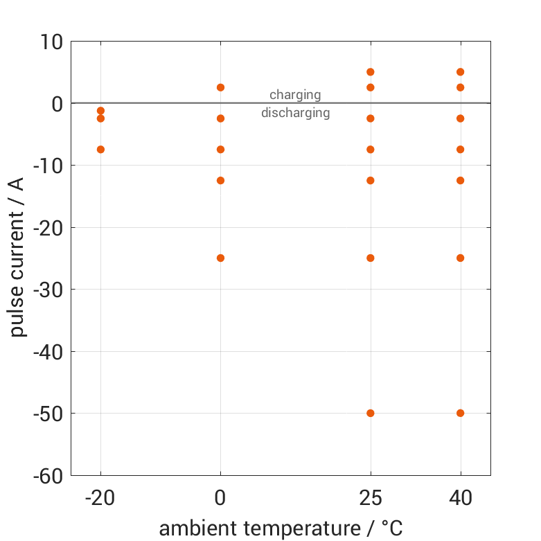 The cell is discharged from 100% SOC or charged from 0% SOC with current pulses followed by no-load phases at different ambient temperatures. The thermal boundary condition is free convection. The measurement stops when reaching either the voltage of 2.5V or 4.2V or the surface temperature of 75°C. The graph shows for which ambient temperatures and pulse currents measurements are available.