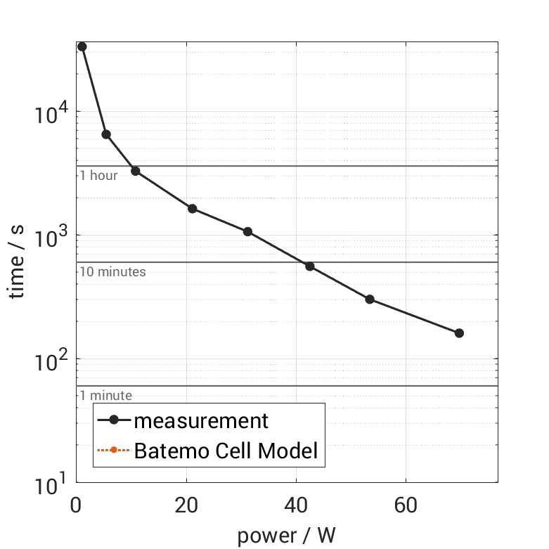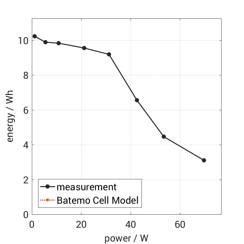 All quantities are measurement results from the Batemo battery laboratory. The continuous power is the highest power that completely discharges the cell without overheating it. Therefore, the cell is discharged from 100% state of charge (SOC) at an ambient temperature of 25°C with a constant current until a residual state of charge of 10% and either the lower voltage limit of 2.5V or 90% of the maximum surface temperature ( 54°C) is reached. The peak power is the power the cell can supply for 5 minutes. The cell is therefore discharged from 100% SOC at an ambient temperature of 25°C with a constant current until it reaches either the lower voltage limit of 2.5V or the maximum surface temperature of 60°C after 5 minutes. For cells that reach the maximum temperature limit, the measured power is directly taken as peak power. For cells that do not reach the maximum surface temperature after 5 minutes because they reach the lower voltage limit first, the measured power is multiplied by a correction factor that estimates the power that would have heated the cell to the maximum surface temperature within 5 minutes. The thermal boundary condition is free convection. These operating conditions may be outside the cell manufacturer’s specification. |